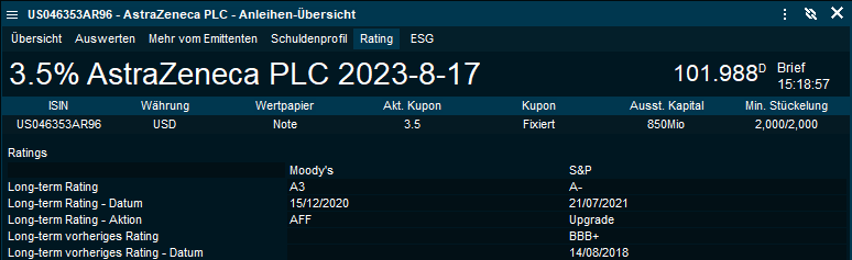 Der "Anleihen-Übersicht" wurde eine neue Registerkarte hinzugefügt, auf der die Informationen für die jeweilige Anleihe zusammengefasst sind. Langfristige Ratings werden auf der Registerkarte "Übersicht" angezeigt: