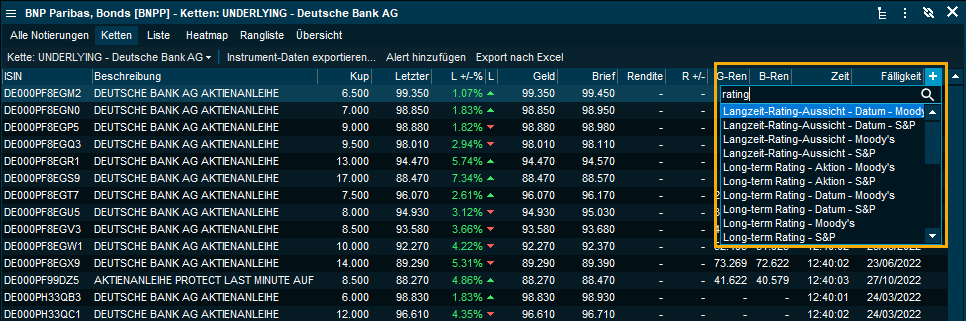 Sie können Spalten hinzufügen, indem Sie das Icon "+" rechts neben den Spalten verwenden. Oder Sie können die gesamte Auswahl im Dialogfenster "Spalten auswählen" in der Kategorie "Kreditratings" einsehen: