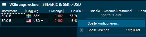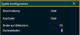 Im separaten Fenster des Währungsumrechners können nun die Eigenschaften jeder Spalte bearbeitet werden, um z. B. die Anzahl der Dezimalstellen in einer Spalte zu steuern.