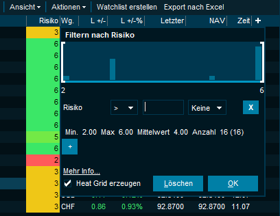 Die fondsspezifische Risiko-Scoring-Methode SRRI (Synthetic Risk and Reward Indicator) kann nun unabhängig von der Fondsübersicht und dem Screener als eigene Spalte in Markt- und Watchlists angewendet werden.