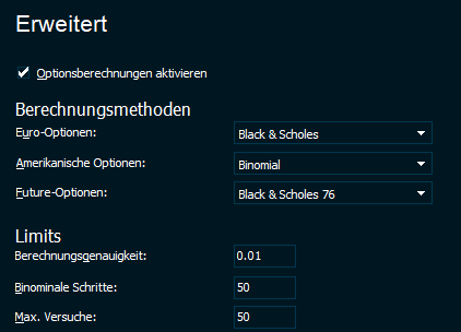 Optionsberechnungen aktivieren | Wenn diese Option aktiviert ist, berechnet Infront Professional Terminal die "Griechen" unter Verwendung der angegebenen Preisberechnungsmethoden. |