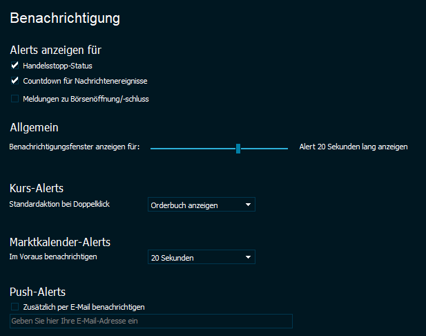 Zusätzlich per E-Mail benachrichtigen | Wenn ein Alert durch eine Aktivität an den Märkten ausgelöst wird, können Sie die Benachrichtigungen per E-Mail erhalten (nur Watchlist- und Kurs-Alerts). |