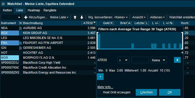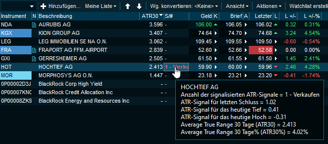 Die Spalte "ATR30" (Average True Range 30 Tage) wird bereits unterstützt. Dieser Wert misst die typische/statistische Volatilität der letzten 30 Tage in Form von nominalen Kursänderungen an.