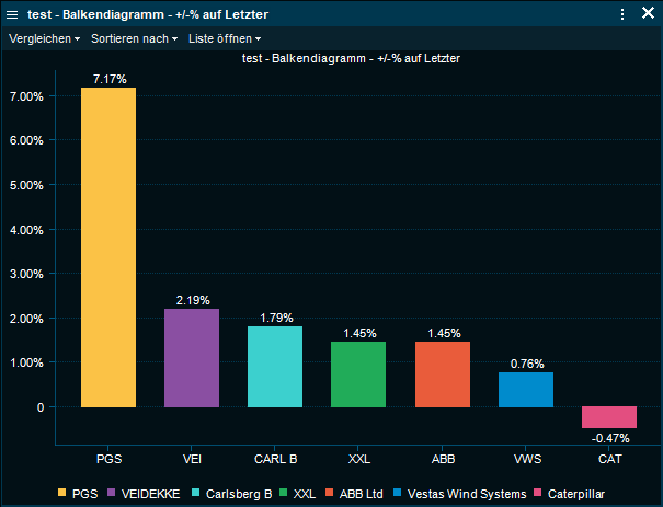 Das Balkendiagramm zeigt ein oder mehrere Instrumente nebeneinander an. Standardmäßig wird die Nettoveränderung des ausgewählten Instruments in Prozent angezeigt. Es kann so konfiguriert werden, dass es eine Reihe von historischen Werten darstellt, so dass Sie die Performance der Instrumente schnell vergleichen können.
