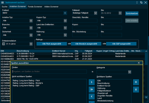Anleihen-Screener: Konfiguration der angezeigten Spalten