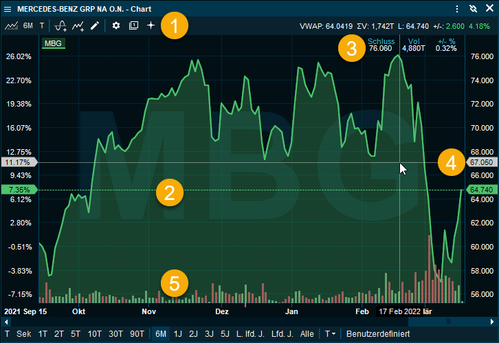 Volumen-Balken (5) | Diese werden im Hintergrund als grafischer Indikator der Umsätze angezeigt. |