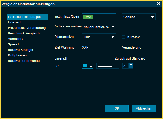 Vergleichen Sie Indikatoren mit verschiedenen Instrumenten, indem Sie einen "Vergleichsindikator" wählen. Wenn Sie ein Instrument hinzufügen, können Sie auch die Achse, Währung oder den Linienstil ändern. Der Vergleichsindikator kann auch indexiert werden und Sie können prozentuale Veränderungen anzeigen, Benchmarks vergleichen und vieles mehr.