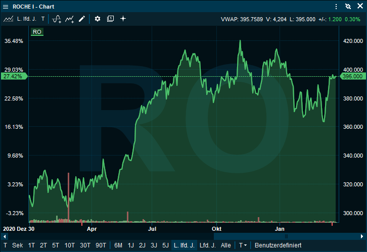 Schauen Sie sich zum Beispiel die extremen Bewegungen von Roche ab dem Beginn von COVID-19 und dem Tiefpunkt am 12. März 2020 bis zur Erholung zurück zum Höchststand im Mai 2020 genauer an.