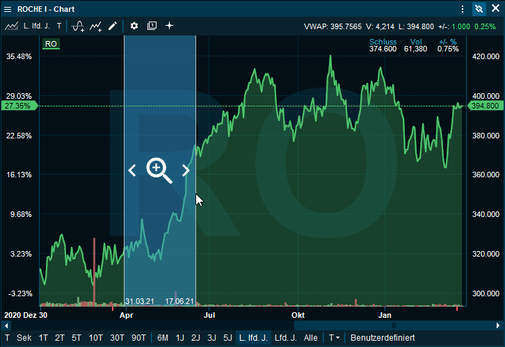 Sie können einen bestimmten Zeitraum in einem Diagramm schnell heranzoomen. Dabei wird die prozentuale Performance auf der linken Achse angepasst und die Rendite für diesen Zeitraum automatisch neu berechnet.
