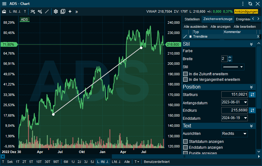 Die Einstellungen, die Sie für Zeichnungen im Chart vornehmen, werden jetzt automatisch als Standardeinstellungen für alle neuen Anmerkungen desselben Typs gespeichert, die Sie später hinzufügen.