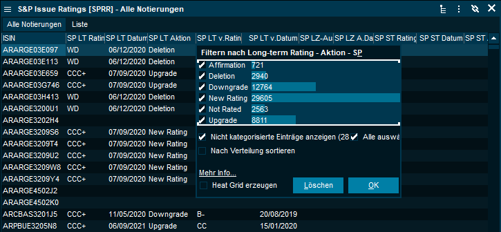 - In den Ansichten "Markt" und "Watchlist" kann dies auf alle Agenturen angewendet werden, um die Spalten mehrerer Rating-Agenturen anzuzeigen (d. h. S&P und Moody's). Außerdem zeigt das Spaltenfilterwerkzeug die Verteilung in einem bestimmten Markt oder aus dem Agenturuniversum an.