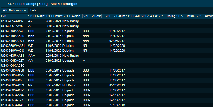 In den Feeds der einzelnen Agenturen werden die entsprechenden Spalten automatisch ausgefüllt, wie unten bei S&P zu sehen ist: