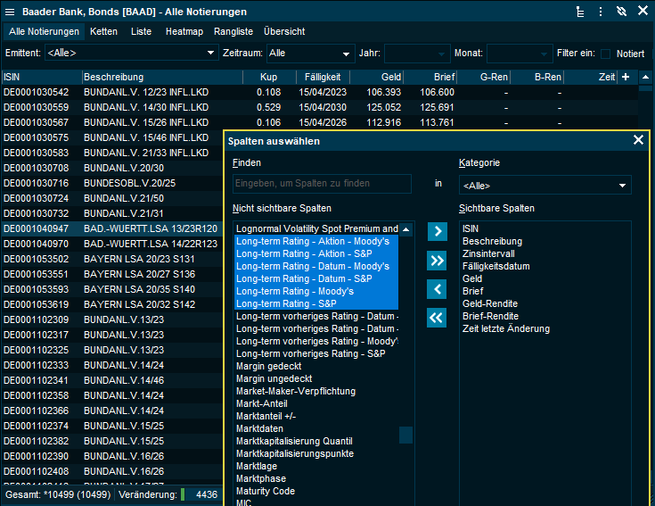 Sie können Spalten hinzufügen, indem Sie das Icon "+" rechts neben den Spalten verwenden. Oder Sie können die gesamte Auswahl im Dialogfenster "Spalten auswählen" in der Kategorie "Kreditratings" einsehen: