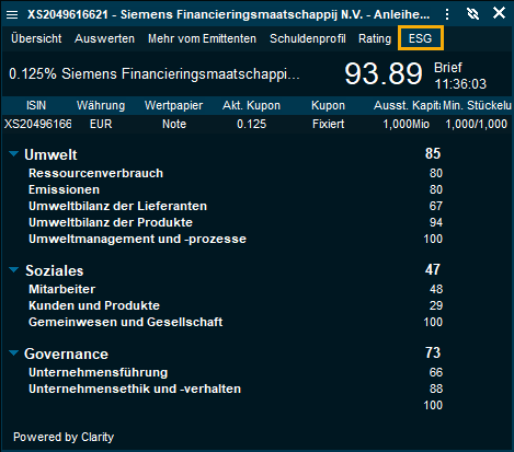 Bei Unternehmensanleihen wird der Risiko-Score des jeweiligen Emittenten auf die Anleihe angewendet, ähnlich wie der Emittenten-Score auf Aktien in der bekannten Granularität von 3 Ebenen angewendet wird: