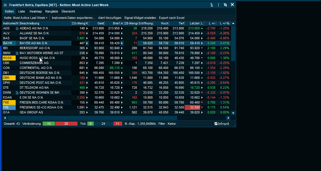 Das Fokusfenster gibt dem Benutzer einen schnellen Überblick über ein bestimmtes Instrument. Das Instrumentfeld kann entweder das Symbol oder den vollständigen Namen des Instruments anzeigen. Im Kursfeld können Sie zwischen dem letzten Geld- oder Briefkurs wählen. Darunter werden entweder die Veränderung +/- oder die Veränderung +/-% oder beide angezeigt. Unten zeigt der Änderungsindikator den aktuellen Trend auf Grundlage des Kursfeldes an. Der rechte Teil des Fensters besteht aus einem Bereich, in dem die Werte an beiden Enden den heutigen Höchst- und Tiefststand anzeigen. Ein Pfeil zeigt an, wo sich der Kurs im Verhältnis zum Hoch/Tief befindet, und der Balken wird bei negativen Werten seit Eröffnung rot und bei positiven Werten blau dargestellt.