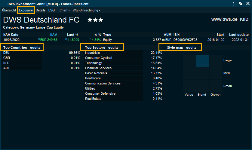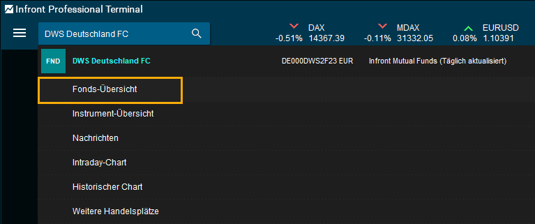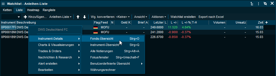 Klicken Sie mit der rechten Maustaste auf das Instrument > wählen Sie "Instrument-Details" > "Fonds-Übersicht".