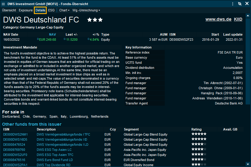 Die Registerkarte "Details" enthält wichtige Informationen sowie das Anlageziel des Fonds.