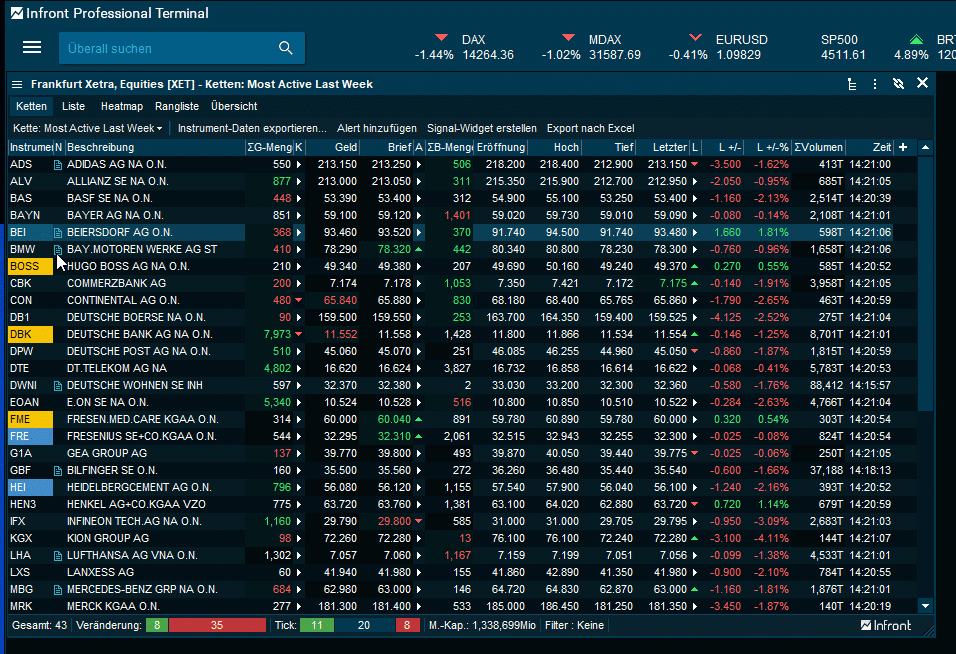 Das Fenster "Instrument-Übersicht" ist eines der am häufigsten verwendeten Fenster in Infront Professional Terminal. Hier sind viele Informationen kompakt angeordnet und durch Registerkarten übersichtlich verteilt.