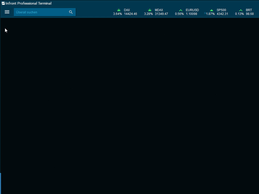 Das Marktfenster ist neben der "Watchlist" und der "Marktübersicht" eine der wichtigsten Möglichkeiten, eine Liste von Streaming-Kursen zu sehen. Alle Informationen werden ständig aktualisiert und Kursänderungen werden hervorgehoben. Auf einigen Märkten können viele Tausende Instrumente verfügbar sein. In diesem Fall zeigt Infront Professional Terminal nicht die Registerkarte "Alle Notierungen", sondern wechselt stattdessen auf die Registerkarte "Ketten".