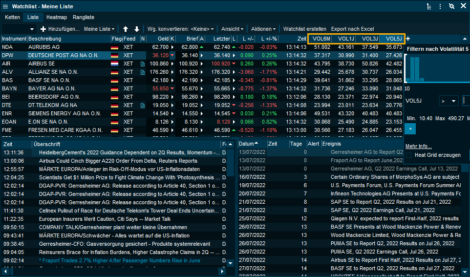 Die Watchlist enthält nun zusätzliche Spalten für Volatilitätsperioden, die sich über einen längeren Zeitraum erstrecken.