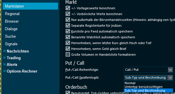 Bei der Bearbeitung der Liste der Spalten, die auf der Put-Call-Seite angezeigt werden sollen, gibt es eine spezielle Logik, um einige der Spalten zu spiegeln und zu duplizieren, damit die Feldwerte sowohl für die Put- als auch für die Call-Optionen in derselben Zeile angezeigt werden. Um horizontalen Platz im Fenster zu sparen, wird das Hinzufügen einer Beschreibungsspalte standardmäßig nur auf der linken Seite (Call) verwendet. Für einige Märkte ist es sinnvoller, die Beschreibungen sowohl auf der Call- als auch auf der Put-Seite anzuzeigen, daher haben wir eine Einstellung hinzugefügt, die dies ermöglicht: