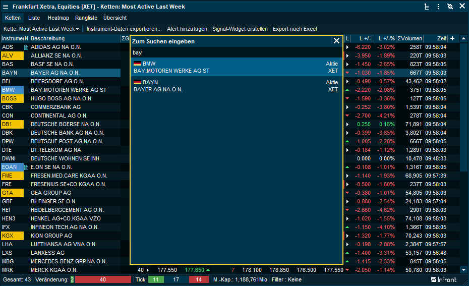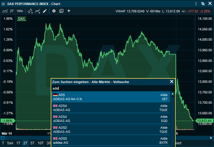Suchen Sie direkt in einem Chart, einer Watchlist, einem Orderbuch oder einem Marktfenster. Suchen Sie nach dem gewünschten Instrument in einem automatisch eingeblendeten Suchfenster.
