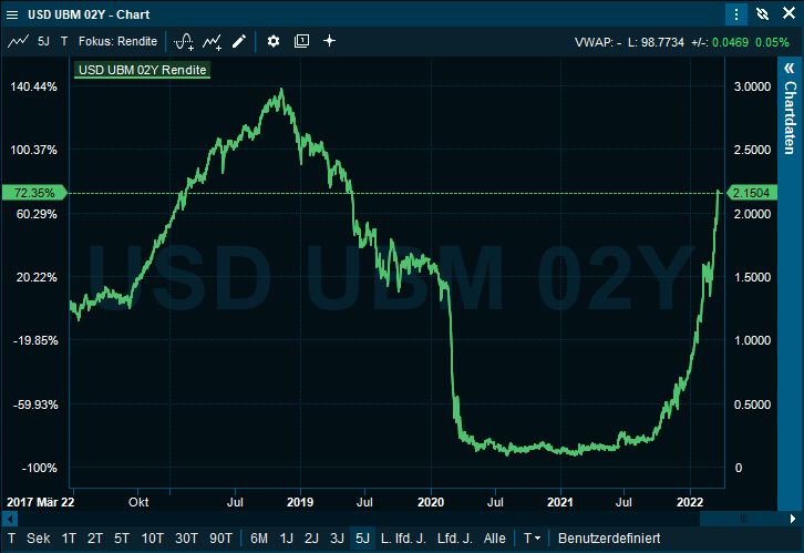 In der rechten oberen Ecke können Sie die Bestandteile des Spreads auf der Grundlage des vorhandenen Kurvendiagramms auswählen. Die folgende Grafik zeigt die deutsche (TMBMKDE) und die US-amerikanische (TMUBMUSD) Renditekurve in blau bzw. orange. Die gelbe Linie stellt den Spread zwischen den beiden dar. Zusätzliche Kurven können für weitere Spread-Charts hinzugefügt werden.