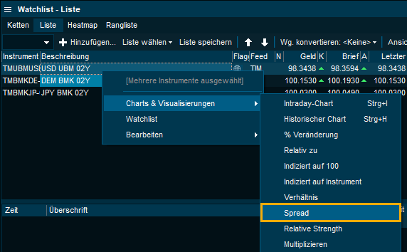 Historische Spreads können immer direkt eingezeichnet werden, indem Sie zwei Instrumente auswählen, mit der rechten Maustaste klicken und den Spread auswählen: