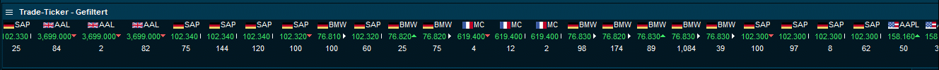 Ähnlich wie die Registerkarte "Trades" in der Instrument-Übersicht zeigt der Trade-Ticker Zeit- und Verkaufsinformationen an. Der Trade-Ticker kann Trades für viele Instrumente aus einer Reihe von Märkten und Asset-Klassen anzeigen.