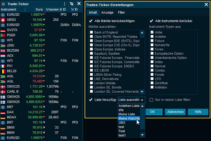 Auf der Registerkarte "Inhalt" legen Sie fest, welche Märkte und Asset-Klassen (Instrument-Typen) Sie im Trade-Ticker sehen möchten. Sie können auch auswählen, dass nur Instrumente aus einer Watchlist angezeigt werden.