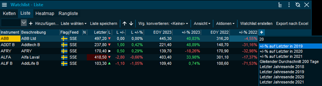 Im Watchlist-Fenster stehen 9 neue Spalten zur Verfügung, die historische Jahresendwerte und prozentuale Veränderungen für die letzten 5 Jahre anzeigen: