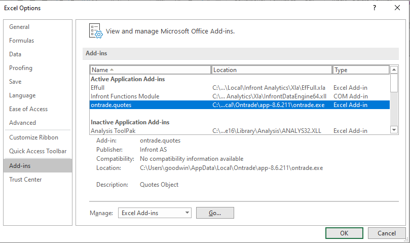 Stellen Sie sicher, dass "ontrade.quotes" als aktiv angezeigt wird. Vergewissern Sie sich, dass das Add-In nicht unter "Inaktive Anwendungs-Add-Ins" zu finden ist. Wenn das Add-In als inaktiv angezeigt wird, versuchen Sie, es erneut zu aktivieren.