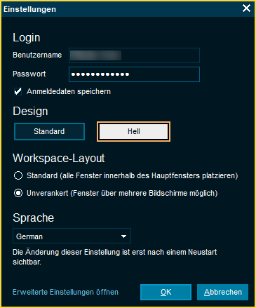 Im Standardmodus gibt es ein großes Hauptfenster, das alle einzelnen Fenster (wie Märkte, Orderbücher, Watchlists und Charts) enthält. Das macht es sehr benutzerfreundlich, schränkt aber die Flexibilität ein, wo Sie Fenster und externe Anwendungen platzieren können. Um diese Einschränkungen zu überwinden, haben wir einen optionalen Modus eingeführt, den unverankerten Modus. Im unverankerten Modus kann jedes einzelne Fenster über mehrere Bildschirme gezogen werden und ist nicht auf ein großes Hauptfenster beschränkt.