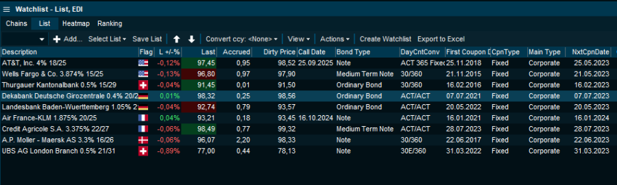 On the Frankfurt Floor market, you can now sort and filter the market based on when bonds may be called, their coupon spread and many others: "Fixed Income" column layout or configuration of the below can easily be done in any market or watchlist.
