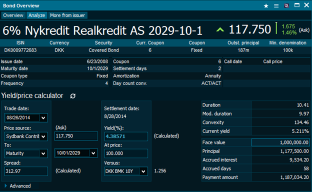 Unique "Bond Overview" pages consolidate data for the instrument and display it in a way that provides the user with critical information in a timely and effective way. Bond overview covers reference data, market and indicative prices and an overview of the other issues from the same issuer. From here, the user can navigate further to each and every venue the bond is traded on, issuer fundamentals or proceed with analytics. Yield calculator calculates yield from price and price from yield until Maturity, Next call, Worst as well as a Custom date. The calculated yield is compared to a benchmark for spread analysis. Last but not least, the user can calculate the payment amount for a transaction taking into account principal and accrued interest.