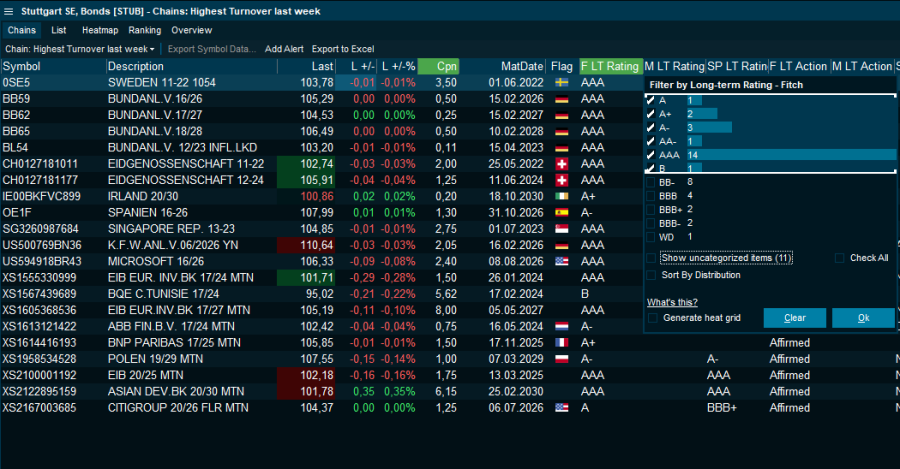 - Every column offers filtering capabilities, allowing you to screen on a market or agency universe. Typical filtering scenarios include: only investment grade ratings, only the most recent assessments by date or only affirmations. For example, you can filter the Frankfurt Floor market based on Fitch rating, only "B" and above, by simply sliding the bar to the preferred level: