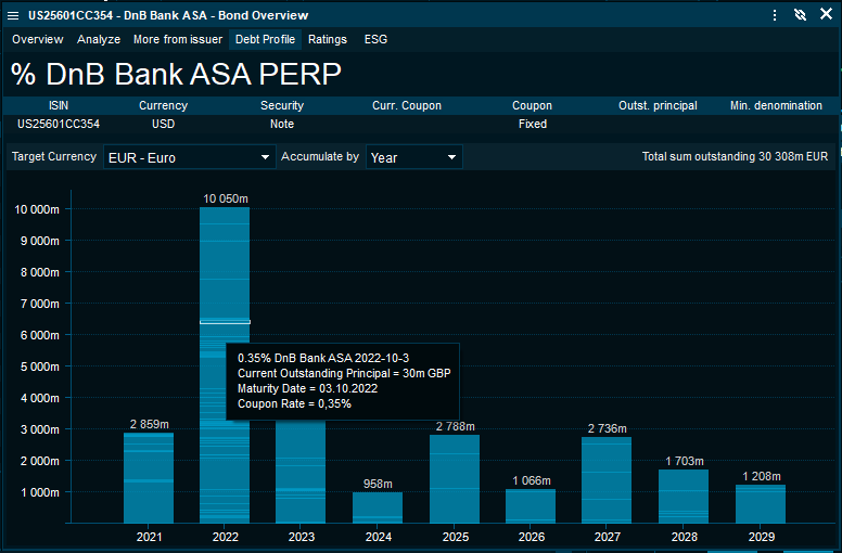 The "Debt Maturity" profile now detects the number of outstanding bonds from the issuer and dynamically optimises the presentation of the bar chart. Thus, a bank with several hundred mortgage bonds will be summarised to single columns on an annual basis for a view that is easier to read.