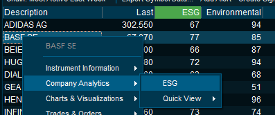 - A new column set is introduced to be applied in market overview and watchlists to bring forward this advanced dataset. Applying the terminal's column sorting and filtering, this enables you to easily screen and structure an entire market based on overall ESG score. Detailed parameters such as Supplier Footprint or Corporate Ethics may be applied as well as seen in the example with the Xetra exchange below: