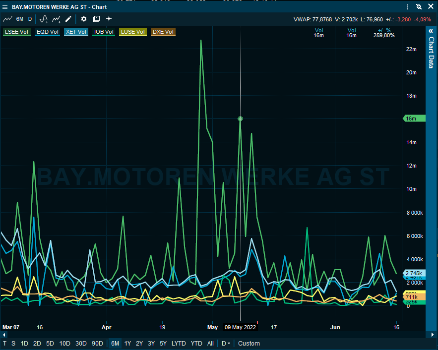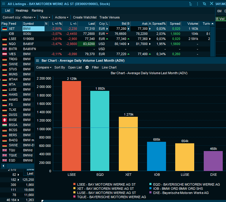 In the example below, Average Daily Volume (ADV) last month is presented in a bar chart where we can see that the majority of trade flow on the BMW stock is in fact not on its primary market Xetra, but London SE followed by Equiduct.