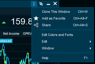 Most windows in the Infront Professional Terminal have a "⋮" tools menu in the top right corner for quick access to settings of the current window.