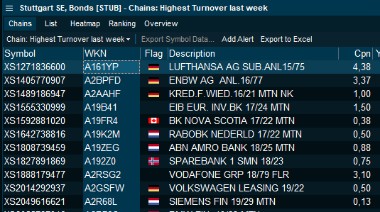 As with the "Ratings", this data can be applied as columns, allowing you to screen or sort a market and combine your own selections in a watchlist for further comparison and analysis.