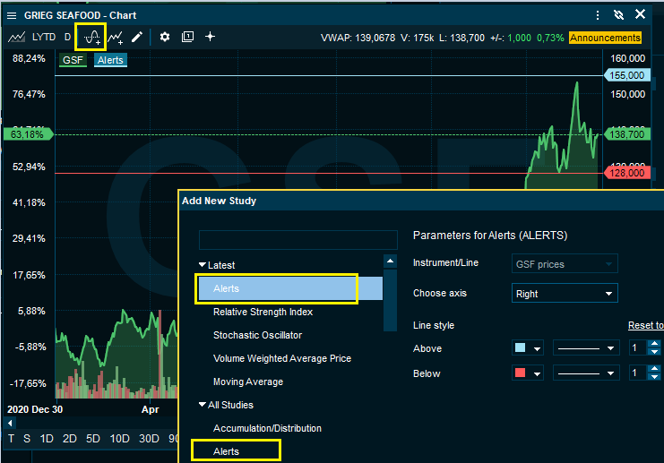 This can be added from the chart study directly in the toolbar and all active alerts on the individual instrument will be applied with distinguished colours respective to their condition or alert type: