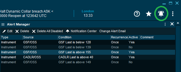 Alerts can be viewed and managed in the designated "Alert Manager" window found by clicking the bell icon in the top right corner of the terminal.