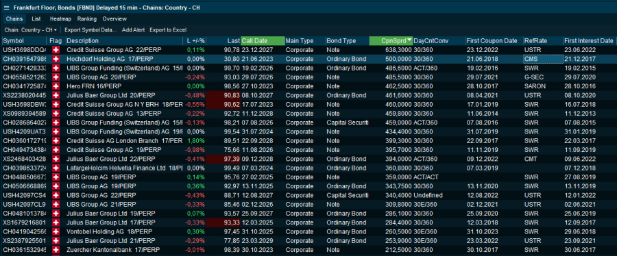 On the Frankfurt Floor market, you can now sort and filter the market based on when bonds may be called, their coupon spread and many others: "Fixed Income" column layout or configuration of the below can easily be done in any market or watchlist.