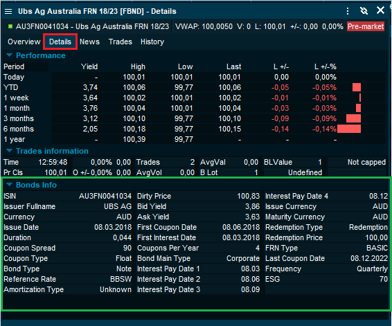 On the individual instrument level, the consolidated data can be seen under "Bonds Info" on the "Details" tab: