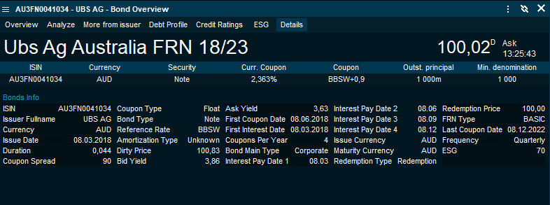 From thi,s you can see and analyse bonds data based on when Interest pay dates are coming up which is key to calculating accrued interest and bond valuation, reference rates for spread calculations and upcoming call dates and crucial for refinancing.