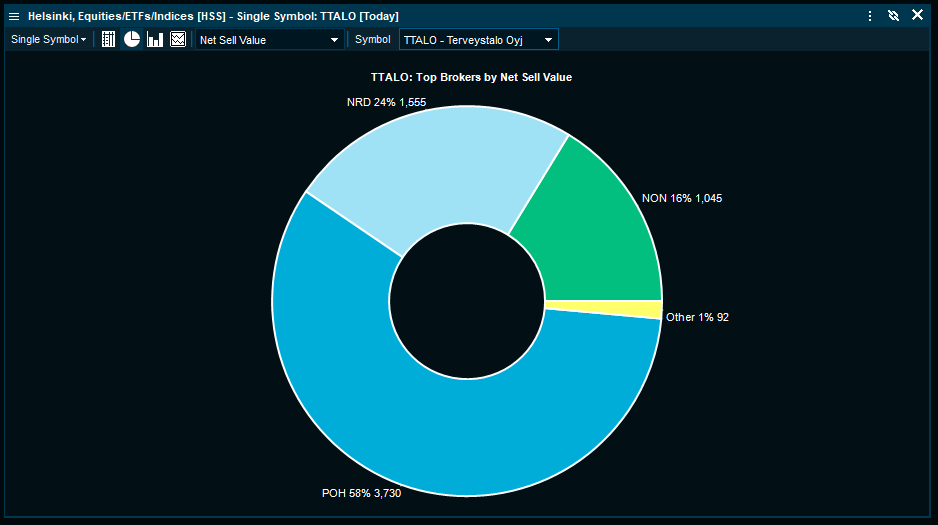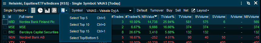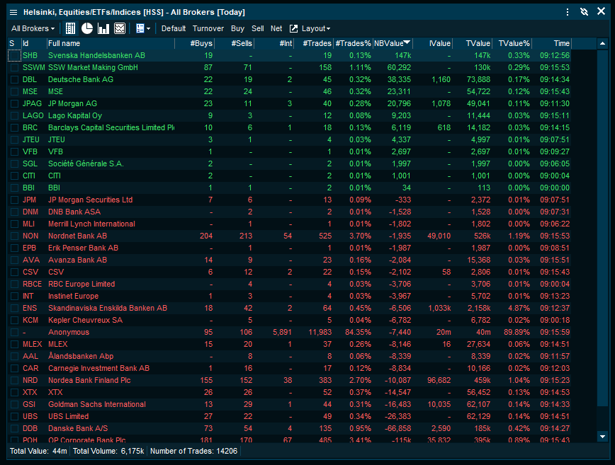 Statistics for one symbol where all active brokers activity is accumulated. This view displays accumulated data on all brokers active for the selected symbol. This enables you to get fast access to the brokers that are the largest buyers, sellers, most active and so on.