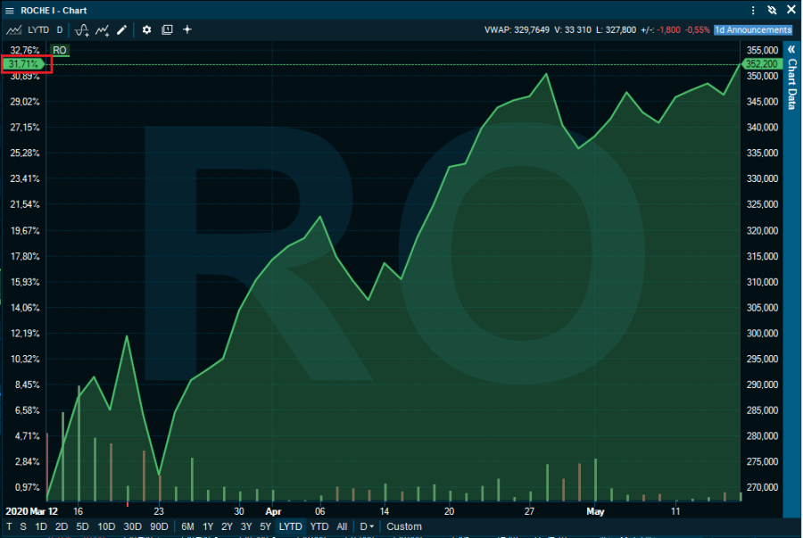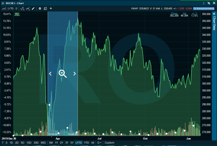 For example, to take a closer look at the extreme movements for Roche as of COVID-19 hit and the lowest point at March 12, 2020 to the recovery back to the top at May 2020.