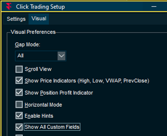 The Click Trading window now has a new setting to include all custom fields as inline editable in the side panel.