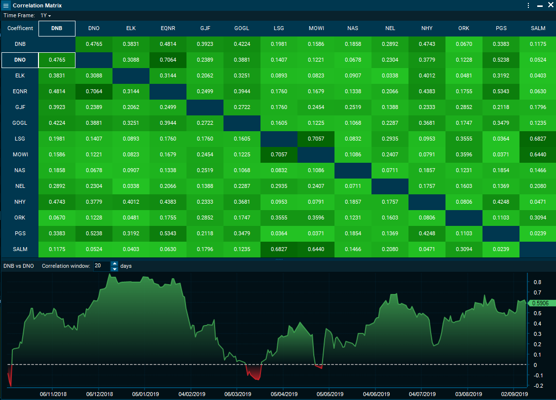 Matrix | Displays the cross-correlation across instruments as in "Pearson Correlation Coefficient". The coefficient displayed in the Matrix corresponds to the entire sample given the time frame selected at the upper left of the window. |